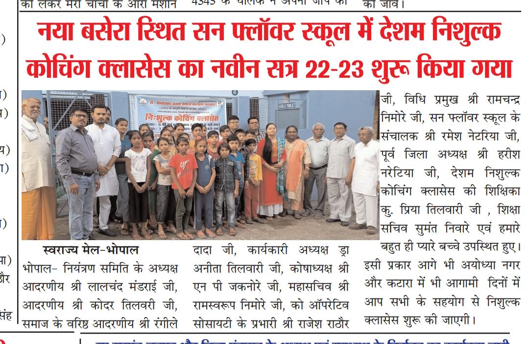 दिनाँक 01.08.2022 को अयोध्या नगर, क्षेत्र में कक्षा 5 वीं से कक्षा 8 वीं तक देशम निःशुल्क कोचिंग क्लासेस प्रारम्भ की गई जिसमे देशम के शिक्षा सचिव श्री सुमन्त निवारे जी, श्री रामस्वरूप निमोरे जी महासचिव के साथ अन्य वरिष्ठ सदस्य सम्मलित हुए।